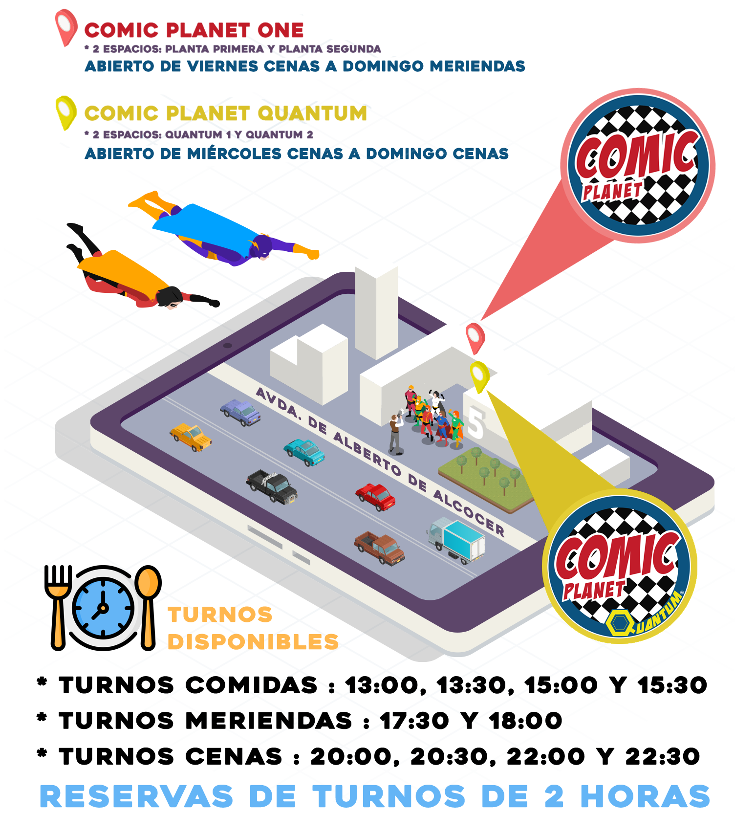 * COMIC PLANET ONE está abierto de VIERNES CENAS A DOMINGO MERIENDAS y cuenta con una tienda donde conseguir lo último en productos de cómics para vuestra colección, comprar un regalo o llevaros un recuerdo de vuestro superhéroe favorito.